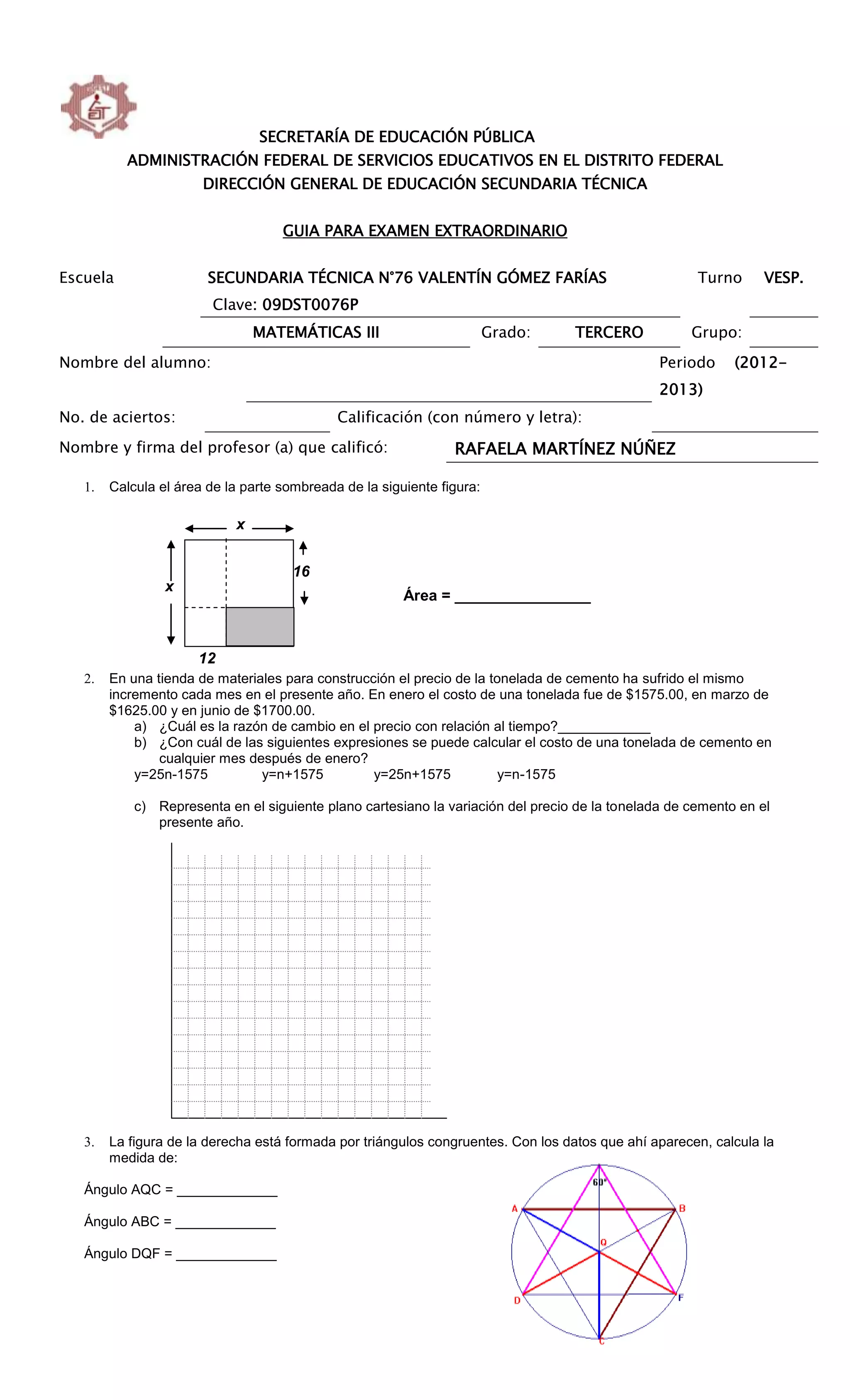 Este documento contiene 21 problemas de matemáticas para un examen extraordinario de matemáticas para estudiantes de tercer grado de secundaria técnica. Los problemas cubren temas como álgebra, geometría, funciones y ecuaciones de segundo grado. Cada problema presenta un ejercicio matemático con instrucciones y en algunos casos figuras para ilustrar la situación problema.