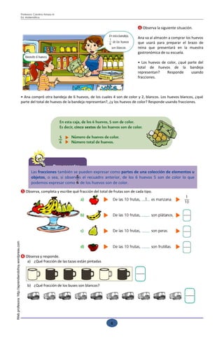 La guía presenta información sobre fracciones para estudiantes de cuarto básico. Explica conceptos como numerador, denominador y cómo expresar cantidades como fracciones de un total. Incluye ejercicios prácticos sobre fracciones en contextos cotidianos como la división de alimentos, huevos y frutas entre personas. Los estudiantes deben completar, calcular y representar gráficamente diferentes fracciones.