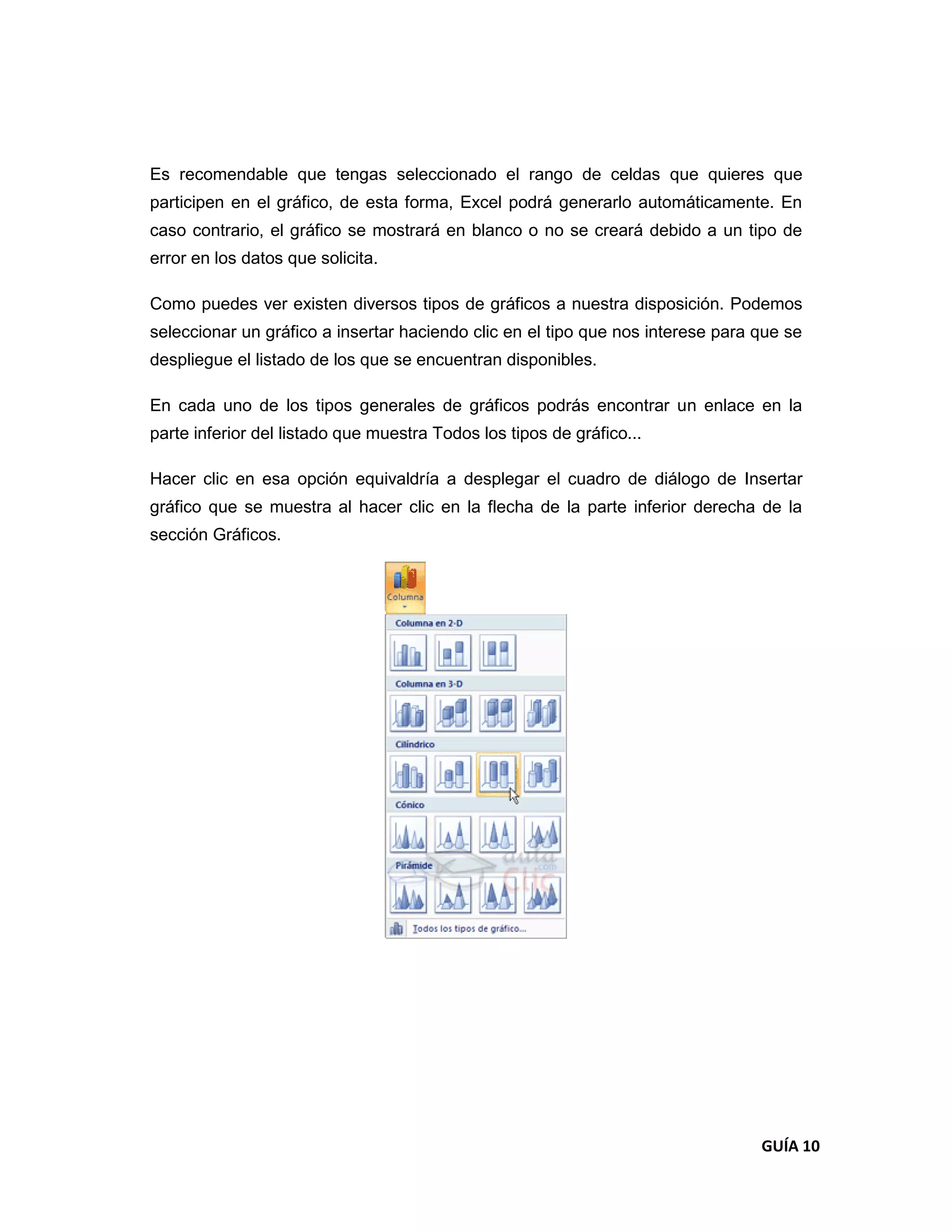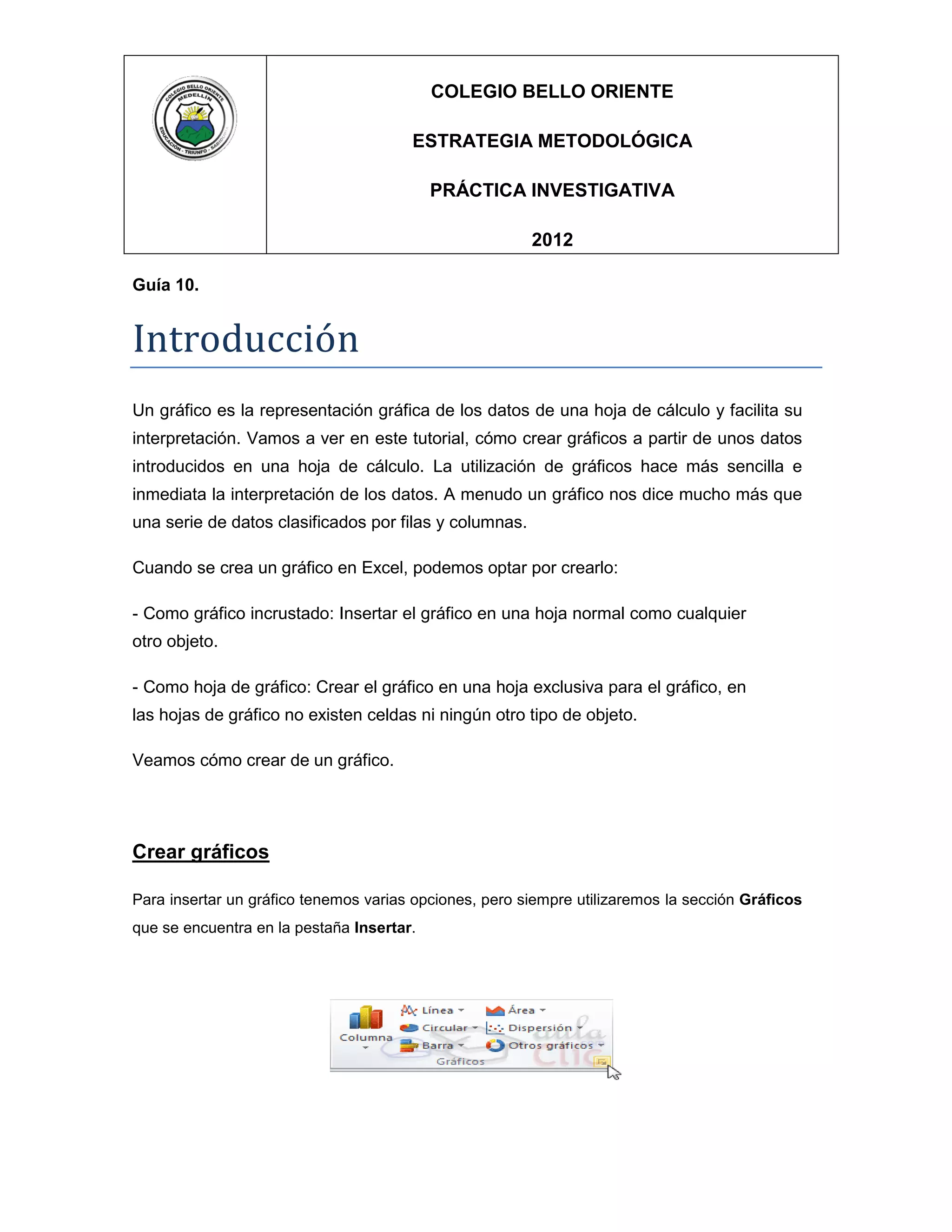 Este documento proporciona instrucciones sobre cómo crear y formatear gráficos en Excel. Explica cómo seleccionar datos, insertar gráficos, modificar sus características y estilos, y moverlos de posición. Además, introduce los minigráficos como una forma compacta de representar datos en una sola celda.