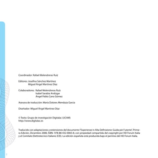 Este documento presenta una guía sobre la televisión en alta definición. Explica las diferencias entre HDTV y SDTV, los formatos de imagen 16:9 y 4:3, y cómo disfrutar de una experiencia en alta definición. También proporciona consejos sobre las condiciones de visión óptimas y la elección entre tecnologías de pantalla como plasma, LCD y LED.