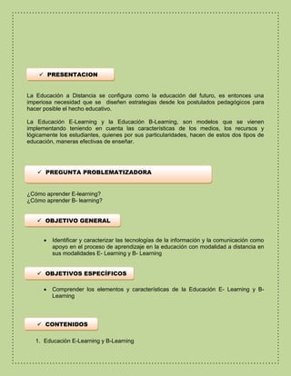 Este documento presenta información sobre la educación E-Learning y B-Learning. Explica que la educación a distancia es fundamental para el futuro y que los modelos E-Learning y B-Learning toman en cuenta las características de los estudiantes y medios. El objetivo general es identificar y caracterizar las tecnologías de la información como apoyo en la educación a distancia. Se pide a los estudiantes que respondan preguntas sobre E-Learning y B-Learning y suban una presentación a SlideShare para compartirla. Finalmente, se participará en un foro sobre est