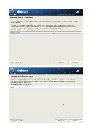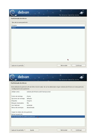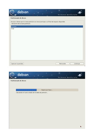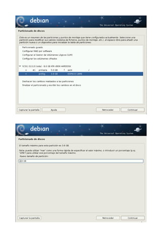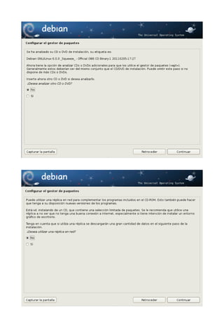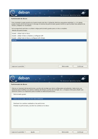 Este documento proporciona una guía paso a paso para instalar Debian 6 (Squeeze). Explica cómo obtener la imagen ISO de Debian, las razones para instalar esta distribución, y detalla el proceso de instalación incluyendo la selección de idioma, configuración de red, particionado del disco, y formato de las particiones. El autor afirma que a pesar de la reputación de Debian como una distribución difícil de instalar, el asistente de instalación es de hecho uno de los más sencillos e intuitivos disponibles actualmente.