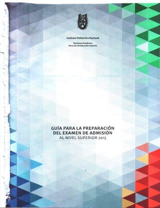 Este documento provee información sobre el proceso de admisión al Instituto Politécnico Nacional (IPN) para el nivel superior, incluyendo detalles sobre la estructura y contenido del examen de admisión. Explica las fechas importantes del proceso como la publicación de la convocatoria, el registro de los aspirantes, la aplicación del examen y la publicación de resultados. También incluye ejemplos de preguntas del examen en diferentes áreas como matemáticas, ciencias y comunicación, así como recomendaciones para la preparación.