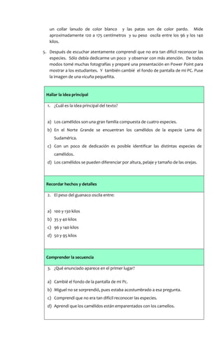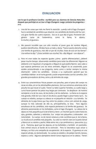Un guía turístico llamado Miguel enseña a un grupo de visitantes a identificar las diferentes especies de camélidos que habitan en el lago Chungará en el norte de Chile. Explica que hay cuatro especies principales - la llama, la alpaca, la vicuña y el guanaco - y describe sus características físicas distintivas como su tamaño, pelaje y orejas para que los visitantes puedan diferenciarlos fácilmente. Una profesora que escucha la explicación toma notas y fotografías para enseñ