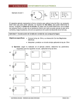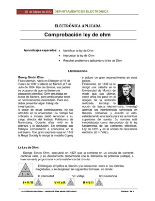 El documento describe una actividad práctica para comprobar la ley de Ohm. Explica la biografía de Georg Ohm, quien descubrió la ley en 1827. La ley establece que la corriente eléctrica en un circuito es directamente proporcional al voltaje e inversamente proporcional a la resistencia. El documento presenta ejemplos para aplicar la ley a circuitos simples, calcular parámetros como corriente y potencia, y graficar los resultados. Finalmente, proporciona un formato para que los estud