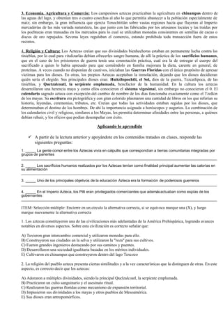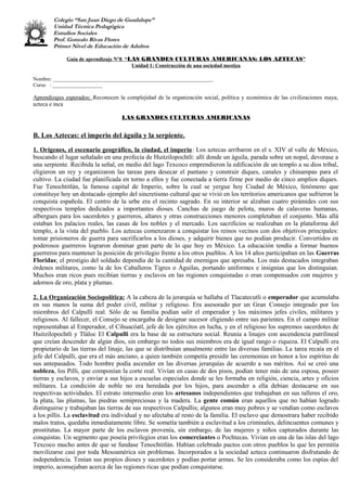 El documento describe la organización social, política y económica de los aztecas. Los aztecas construyeron la gran ciudad de Tenochtitlán en el lago Texcoco y desarrollaron un extenso imperio a través de la conquista de otros pueblos. Tenían una sociedad estratificada gobernada por un emperador y compuesta por nobles, artesanos, campesinos y esclavos. Practicaban la agricultura en chinampas y comerciaban bienes de forma regulada. Creían en dioses como Huitzilopochtli