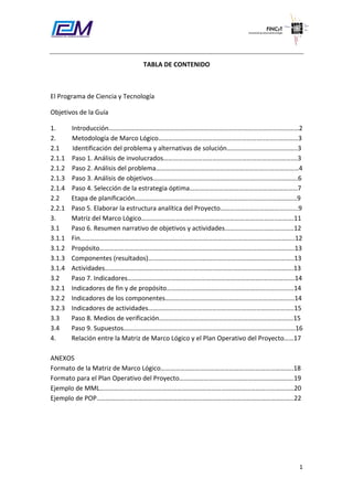 Este documento presenta una guía para elaborar el marco lógico de un proyecto tecnológico. Explica la metodología del marco lógico, incluyendo el análisis de involucrados, el problema y los objetivos, y la selección de la estrategia óptima. Luego describe la matriz del marco lógico, incluyendo los objetivos narrativos, indicadores, medios de verificación y supuestos. El propósito es ayudar a formular proyectos tecnológicos a través de esta met