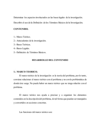 Este documento describe los componentes clave del marco teórico de una investigación, incluyendo antecedentes, bases teóricas, bases legales y definición de términos. Explica que el marco teórico delimita el área de estudio, sugiere guías de investigación y compendia conocimientos previos. Además, detalla cada sección y su propósito, como describir investigaciones anteriores en los antecedentes y presentar conceptos y leyes relevantes en las bases teóricas y legales.