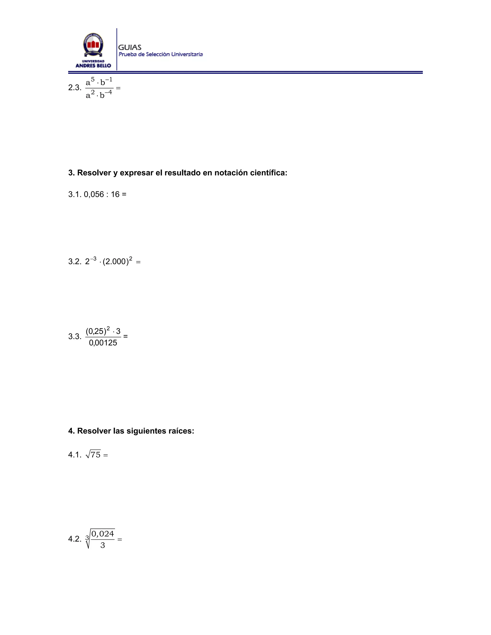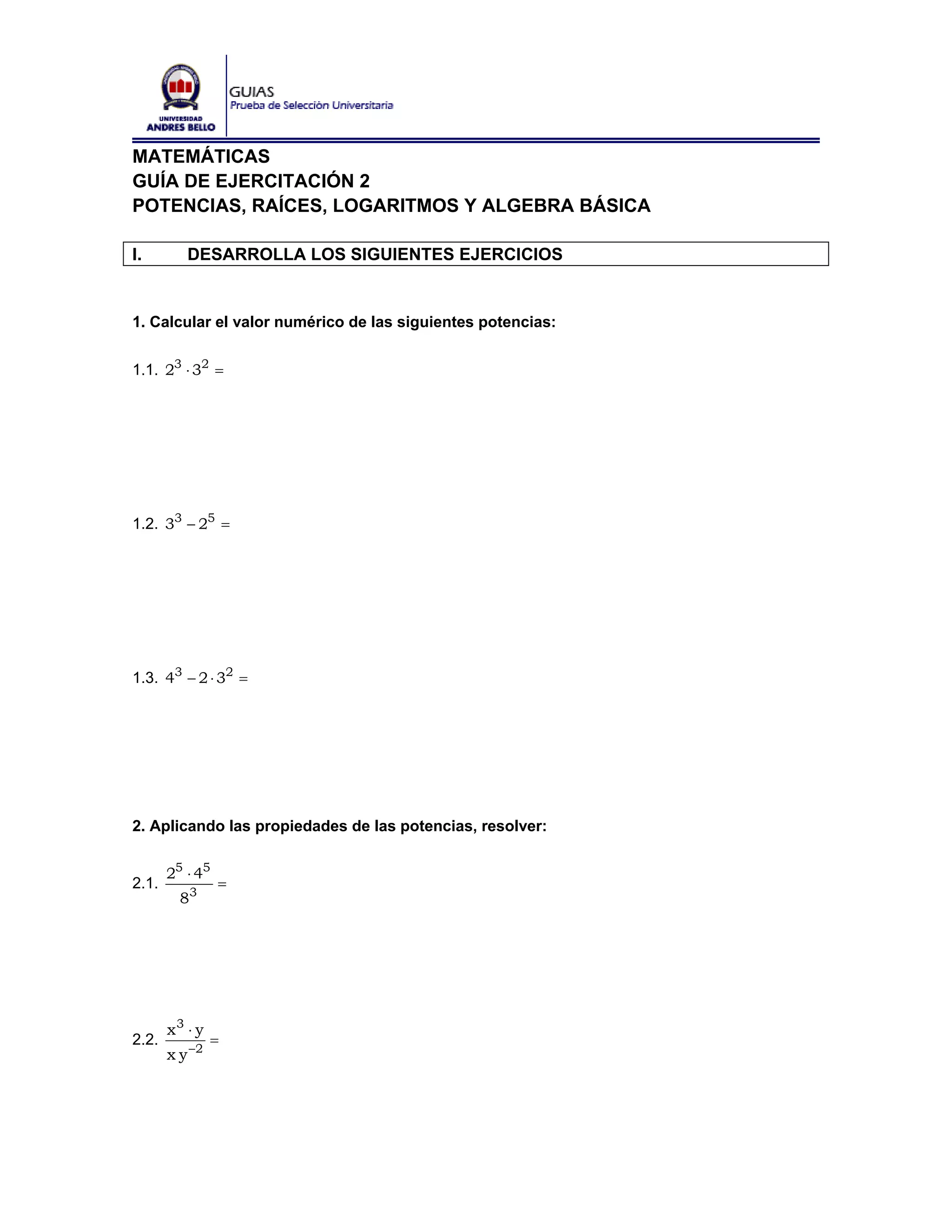 Este documento presenta una guía de ejercitación de matemáticas que incluye ejercicios sobre potencias, raíces, logaritmos y álgebra básica. La guía contiene 15 secciones con más de 100 ejercicios para desarrollar que abarcan diferentes temas matemáticos.