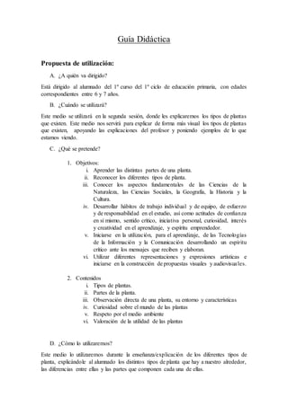 Este documento presenta una guía didáctica para utilizar un power point en una lección sobre tipos de plantas dirigida a estudiantes de primaria de 6-7 años. El power point se utilizará para explicar visualmente los tipos de plantas y sus partes para apoyar la enseñanza del maestro. Antes de la presentación, los estudiantes discutirán plantas que conocen; durante la presentación se les harán preguntas; y después crearán un mural o dibujarán plantas y traerán ejemplos reales para reforzar los
