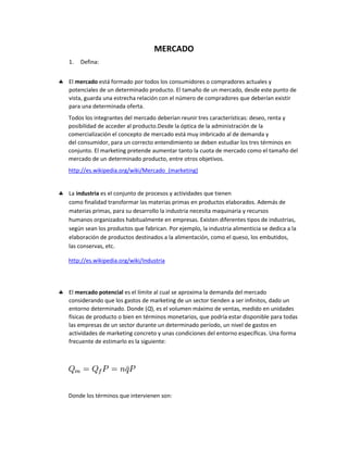 El mercado está formado por los consumidores actuales y potenciales de un producto. Un estudio de mercado analiza al consumidor, la competencia y estima la demanda futura para determinar la viabilidad comercial de un proyecto. El estudio debe medir la calidad y cantidad de la demanda actual y futura del producto o servicio, así como los precios y canales de distribución.