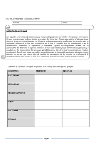 Este documento presenta información sobre microorganismos como bacterias, hongos y virus. Explica que los microorganismos son seres vivos diminutos que solo pueden verse al microscopio e incluyen bacterias, virus y hongos. También describe las características generales de cada tipo de microorganismo y algunas enfermedades que pueden causar. Finalmente, propone actividades para que los estudiantes definan conceptos, respondan preguntas y completen tablas sobre las características y ciclo de vida de los diferentes microorganismos.