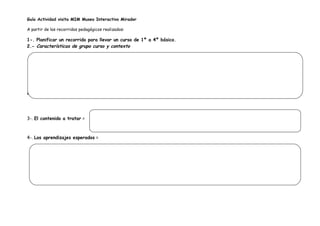 Este documento presenta una guía para una visita educativa al Museo Interactivo Mirador (MIM) con un curso de primer ciclo básico. La guía incluye instrucciones para planificar el recorrido considerando el nivel del curso, los aprendizajes esperados, y actividades. También proporciona antecedentes sobre las instalaciones y exhibiciones del MIM para diseñar efectivamente la visita.