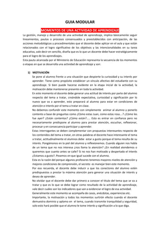 El documento presenta una guía sobre los momentos clave de una actividad de aprendizaje. Describe cinco momentos: 1) motivación, 2) proporcionar información, 3) desarrollo de la práctica dirigida, 4) resolución de problemas y transferencia, y 5) evaluación. El objetivo es ayudar a los docentes a diseñar actividades de aprendizaje efectivas mediante la aplicación estratégica de estos cinco momentos clave.