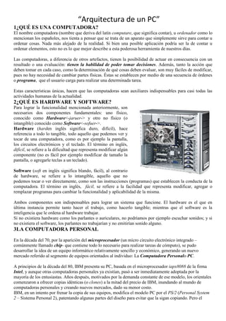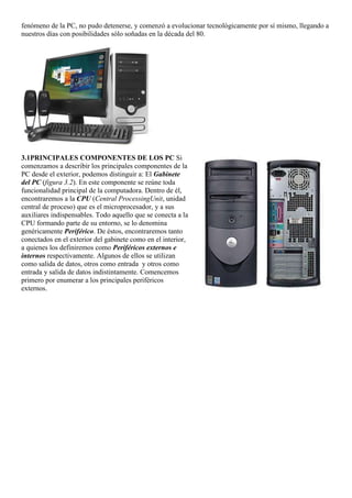 El documento describe los componentes principales de una computadora personal. Explica que un PC está compuesto de hardware tangible como la pantalla y el teclado, y software intangible como los programas. También describe que la llegada del microprocesor en los años 70 permitió el desarrollo de computadoras personales más pequeñas y económicas. Finalmente, enumera los principales componentes de un PC como la unidad central de procesamiento, periféricos internos y externos como pantallas, teclados y parlantes.