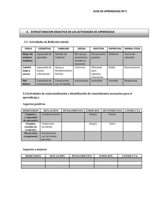 Este documento presenta una guía de aprendizaje que incluye actividades de reflexión inicial y contextualización. La primera sección describe las características físicas, capacidades cognitivas y rasgos de personalidad de una mujer. La segunda sección identifica aspectos positivos de la mujer en las dimensiones cognitiva, familiar y moral-ética, así como aspectos a mejorar. La tercera sección anuncia la estructuración didáctica de las actividades de aprendizaje.