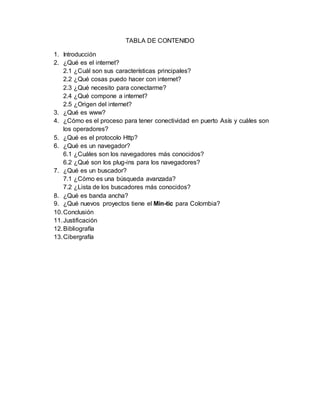 Este documento proporciona información sobre conceptos básicos de internet como qué es internet, sus características, componentes y origen. También explica qué es la World Wide Web (WWW), el protocolo HTTP, los navegadores más conocidos como Chrome, Firefox, Internet Explorer y Safari. Por último, detalla el proceso para obtener conectividad en Puerto Asís, Putumayo y los principales proveedores disponibles.