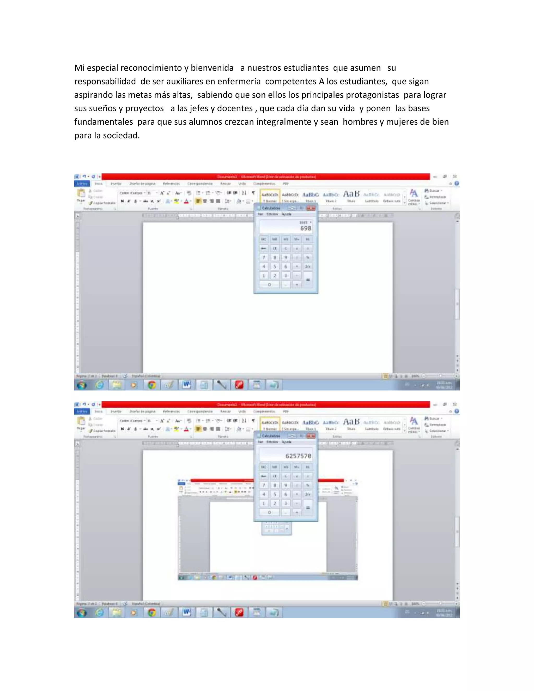 El documento da la bienvenida a los nuevos estudiantes de enfermería y les anima a asumir su responsabilidad como auxiliares competentes. También alienta a los estudiantes a perseguir sus más altas metas y sueños, y reconoce el trabajo de las jefes y docentes en ayudar a los estudiantes a crecer de manera integral y servir a la sociedad.