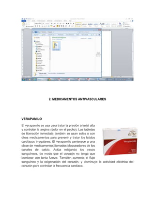 Este documento contiene información sobre varios medicamentos para el corazón y sus usos. Se describen 14 medicamentos antihipertensivos y antiarrítmicos como el verapamilo, metoprolol y sotalol. También se detallan 8 medicamentos para tratar arritmias como la amiodarona, mexiletina y propafenona. Finalmente, se mencionan 6 medicamentos usados en emergencias como la adrenalina, dopamina y noradrenalina.