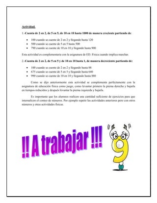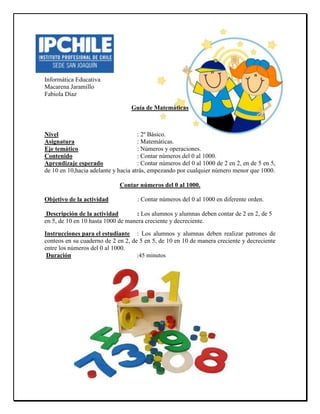 Este documento presenta una guía para una actividad de matemáticas para estudiantes de segundo año básico. La actividad se enfoca en contar números del 0 al 1000 de diferentes maneras. Los estudiantes deben contar de a pares, de a 5 y de a 10 hacia adelante y hacia atrás, empezando desde números menores a 1000. La actividad dura 45 minutos y los estudiantes deben practicar contar números de varias formas para internalizar mejor los conteos.