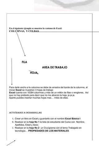 Este documento proporciona una introducción a las funciones básicas de Microsoft Excel 2010, incluyendo una descripción de lo que es una hoja de cálculo, las razones para usar Excel, y las características clave como celdas, filas, columnas, hojas de trabajo y tamaños. También incluye ejemplos de actividades como crear un libro de Excel, agregar una lista de estudiantes y hacer un crucigrama.
