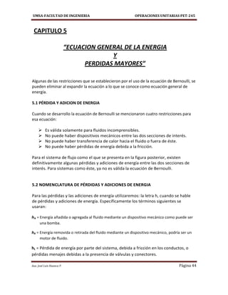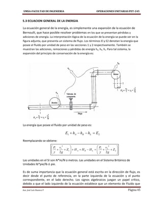 Este documento describe la ecuación general de la energía, que permite resolver problemas de flujo que involucran pérdidas y ganancias de energía. Se define la potencia requerida por las bombas en términos de la energía transferida y la velocidad de flujo de peso. También se explica el número de Reynolds y cómo se utiliza para clasificar los regímenes de flujo laminar, crítico y turbulento. Finalmente, se describen las ecuaciones para calcular el factor de fricción y las pérdidas de presión debido a la fricción en