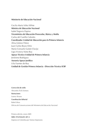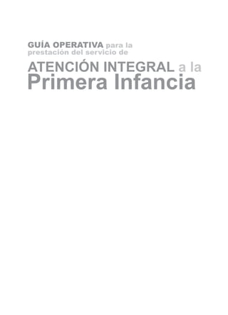 Este documento presenta las directrices para la implementación de la ruta de Atención Integral a la Primera Infancia en Colombia. Establece los referentes conceptuales sobre el desarrollo infantil, las competencias en la Primera Infancia y el papel del agente educativo. Asimismo, explica los referentes operativos como los propósitos, usuarios y esquema operativo del programa. Finalmente, describe las tres modalidades de atención - Entorno Familiar, Comunitario e Institucional - e incluye anexos sobre sus requerimientos y funcionamiento. El objetivo es
