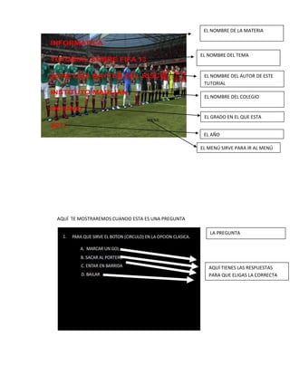 Este documento presenta una guía para explicar el tutorial de FIFA 13. Proporciona información sobre la presentación, una breve prueba de comprensión, el inicio del tutorial, y explica los controles y la historia del juego. Además, detalla los elementos que aparecen durante las preguntas del examen como las respuestas, indicaciones de aciertos y errores, y la navegación entre preguntas.