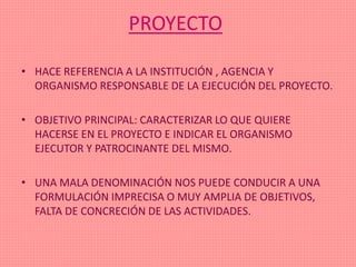 Este documento proporciona una guía para elaborar proyectos. Explica que un proyecto debe identificar la institución responsable, describir el objetivo principal y los problemas que se busca resolver. También debe incluir una descripción del proyecto, la justificación, los objetivos, metas, beneficiarios y la organización responsable de la ejecución. El propósito es proporcionar una estructura para el desarrollo de proyectos que aborden problemas específicos y produzcan un impacto positivo.