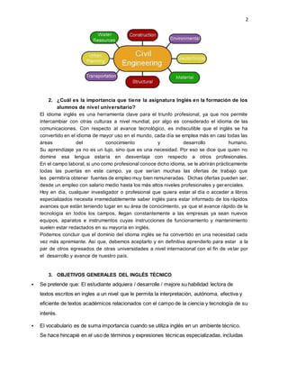 El documento presenta los objetivos de la asignatura de Inglés para estudiantes de ingeniería. Explica que el dominio del inglés es fundamental para que los ingenieros puedan acceder a literatura técnica, entender instrucciones de maquinaria e interactuar con profesionales extranjeros. Los objetivos incluyen mejorar las habilidades de lectura de textos técnicos en inglés, ampliar el vocabulario con términos especializados y estructuras gramaticales útiles, y desarrollar capacidades de comunicación oral simulando situaciones labor