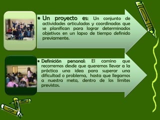 El documento define un proyecto como un conjunto de actividades coordinadas para lograr objetivos dentro de un tiempo definido. Explica que un proyecto comienza con una idea para resolver un problema o necesidad, y pasa por etapas de diseño, ejecución, evaluación hasta alcanzar la meta. Luego describe posibles errores como objetivos muy amplios o soluciones tradicionales sin innovación.