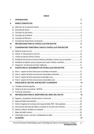 Este documento presenta una guía metodológica para el patrullaje por sector en los gobiernos locales. Define conceptos clave como jurisdicción policial, sector, subsector y cuadrante para organizar territorialmente el patrullaje. Propone formatos de registro diario y mensual para el patrullaje motorizado y a pie. Además, explica cómo elaborar un mapa del delito a partir de denuncias y ocurrencias, e implementar un centro de monitoreo para brindar información a la ciudadanía. El objetivo final es coordinar de manera té
