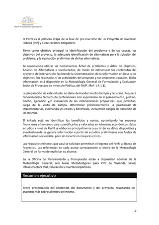 Este documento presenta los contenidos mínimos requeridos para el perfil de un proyecto de inversión pública en la fase de pre-inversión. Detalla los aspectos generales, la identificación del proyecto, la formulación y evaluación preliminar. Entre otros puntos, se debe incluir la descripción del problema y objetivos, alternativas de solución, análisis de demanda y oferta, y estimación preliminar de costos y beneficios de cada alternativa. El objetivo es contar con información básica que permita evaluar la viabilidad