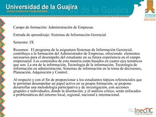 El documento detalla el programa de la asignatura de Sistemas de Información Gerencial, diseñado para formar a futuros administradores de empresas mediante un enfoque participativo y de investigación. Se proponen metodologías que incluyen actividades académicas antes, durante y después de las clases, con énfasis en la criticidad y aplicación práctica en contextos reales. La evaluación es continua y cuantitativa, abarcando parciales y un trabajo final que integra los conocimientos adquiridos en una organización.