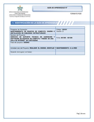 Este documento presenta una guía de aprendizaje sobre diseño e instalación de cableado estructurado y mantenimiento de equipos de computo. Explica conceptos básicos de redes como LAN, WAN, MAN y topologías lógicas. Describe la simbología utilizada en diagramas de redes y presenta actividades para que los aprendices interpreten topologías físicas y lógicas. Finalmente, propone una actividad grupal de diseño de planos lógicos y físicos de una sala de sistemas.