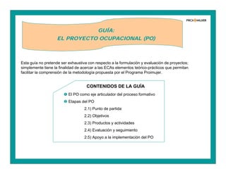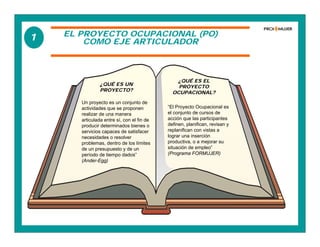 El documento describe las etapas clave del Proyecto Ocupacional (PO) como eje articulador del proceso formativo en el Programa Proimujer. El PO incluye cinco etapas: 1) Punto de partida, 2) Objetivos, 3) Productos y actividades, 4) Evaluación y seguimiento, y 5) Apoyo a la implementación. Cada etapa se relaciona con componentes del diseño curricular y competencias que las participantes deben desarrollar durante la capacitación.