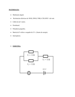 Este documento presenta un estudio sobre la ley de Ohm y su comprobación práctica. Los objetivos son estudiar la ley de Ohm, comprobarla de manera práctica para comprenderla completamente, y medir e implementar circuitos eléctricos simples usando resistencias y una fuente de voltaje para verificar la ley.
