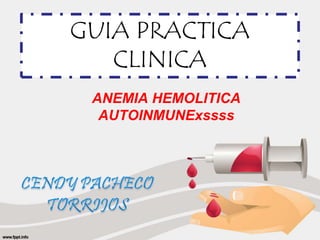 El documento presenta una guía sobre la anemia hemolítica autoinmune. Esta condición ocurre cuando los glóbulos rojos son destruidos por anticuerpos del propio cuerpo. Describe los mecanismos por los cuales los glóbulos rojos son destruidos, los síntomas, las pruebas de diagnóstico como la prueba de Coombs y el recuento de reticulocitos, y los tratamientos incluyendo corticoesteroides, esplenectomía y medicamentos inmunosupresores.
