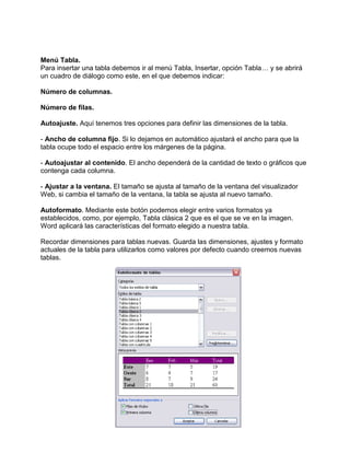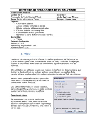 Este documento proporciona instrucciones sobre cómo crear y formato tablas en Microsoft Word. Explica cómo insertar tablas básicas usando el menú Tabla, iconos o dibujándolas, y cómo aplicar estilos, formatos y diseños personalizados. También cubre cómo moverse dentro de las tablas, seleccionar celdas, filas y columnas, y eliminar elementos. Por último, describe la barra de herramientas Tablas y Bordes y sus funciones para trabajar con tablas. El objetivo es que los estudiantes