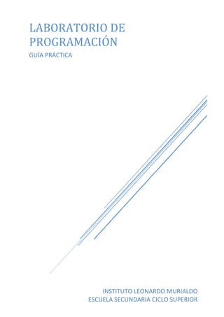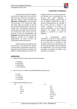 El documento es una guía práctica sobre programación para estudiantes de 4° año en el Instituto Leonardo Murialdo, que introduce conceptos fundamentales como algoritmos, lenguajes de programación, instrucciones y condicionalidad. Incluye ejercicios prácticos sobre expresiones matemáticas, condiciones y ciclos, orientados a la elaboración de programas sencillos. Se abordan problemas de programación aplicados a situaciones cotidianas, facilitando la comprensión de estructuras de control y el manejo de datos.