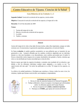 Este documento presenta las guías didácticas de dos unidades sobre biología. La primera unidad introduce el concepto de biología, sus ramas e historia. La segunda unidad cubre las teorías del origen de la vida, la teoría de la evolución de Darwin, y conceptos básicos sobre células, tejidos y sistemas. Las actividades propuestas incluyen foros, presentaciones y videos para ampliar el conocimiento sobre estos temas fundamentales de la biología.