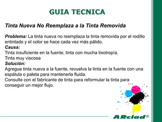 El documento describe varios problemas relacionados con la impresión y la tinta, incluyendo tinta pálida, tinta que se sale de la superficie impresa, y falta de adherencia del pigmento de la tinta. Para cada problema, se enumeran las posibles causas y soluciones como consultar con los fabricantes de tinta y papel, ajustar parámetros como la concentración de la tinta y la solución de fuente, y mejorar los procedimientos y equipos de impresión.