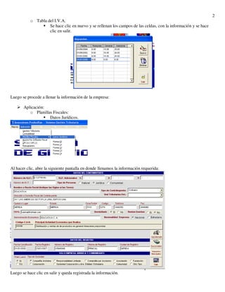 Este documento describe los pasos para configurar la contabilidad en un software contable computarizado. Primero, se selecciona la empresa y se carga la fecha. Luego, se carga la tabla de IVA y se llena la información jurídica de la empresa. Finalmente, se carga el plan de cuentas sugerido y se describen las características y tipos de cuentas.