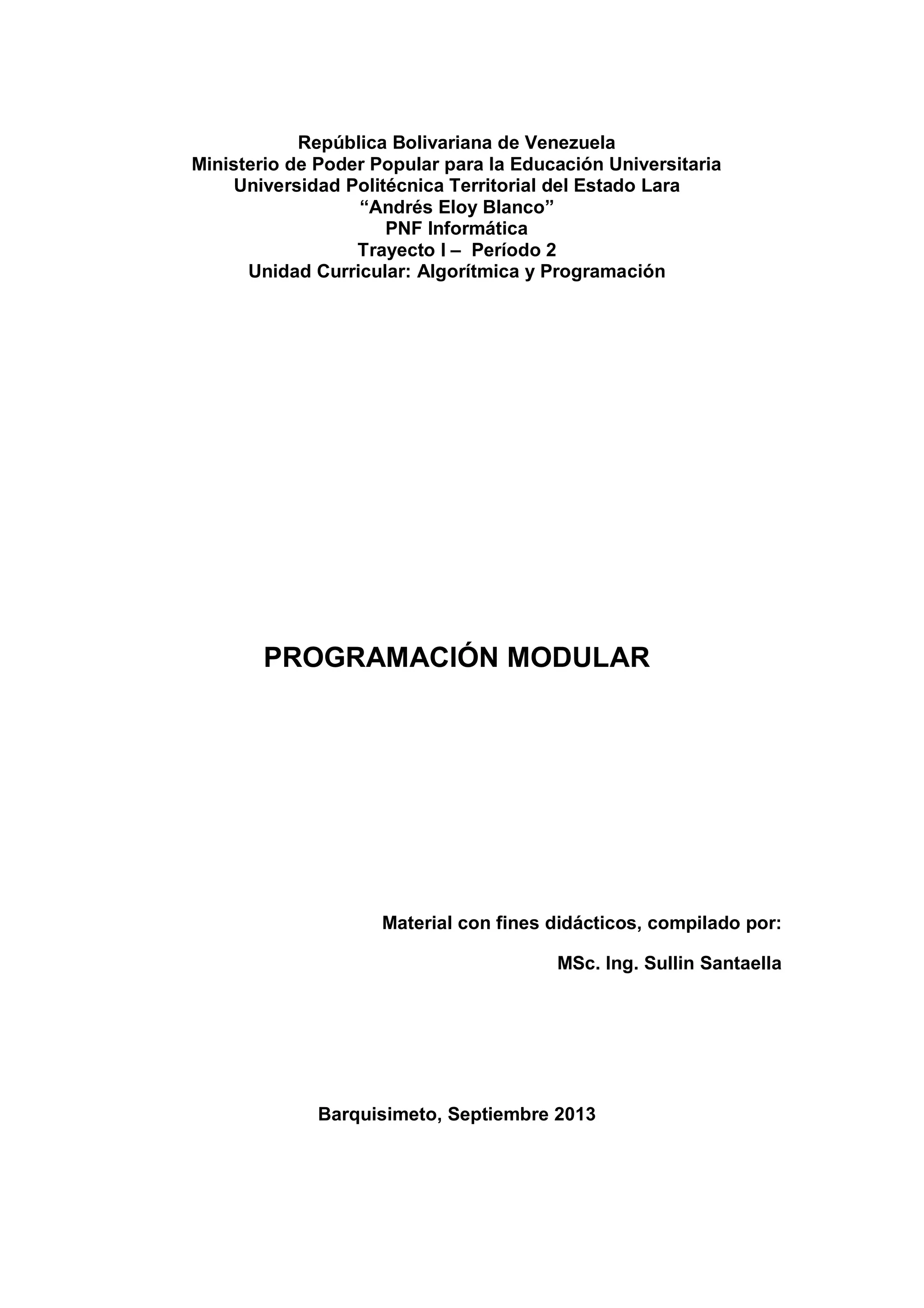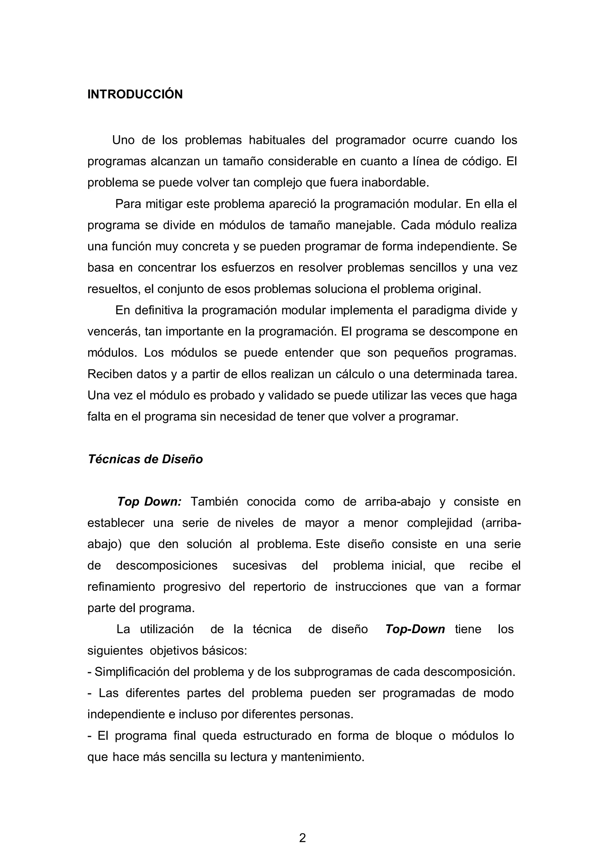 Este documento introduce el concepto de programación modular, en la cual un programa se divide en módulos independientes que realizan tareas específicas. Explica que cada módulo se implementa como una función, la cual recibe parámetros de entrada y retorna resultados. Incluye ejemplos de funciones con diferentes configuraciones de parámetros y muestra cómo implementar funciones para sumar números.