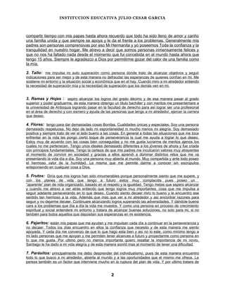 1) La guía describe el árbol de la vida de María Isabel Torres Chaverra, incluyendo sus raíces familiares, su tallo que la impulsa a superarse a sí misma, y sus ramas y hojas que representan sus aspiraciones educativas.