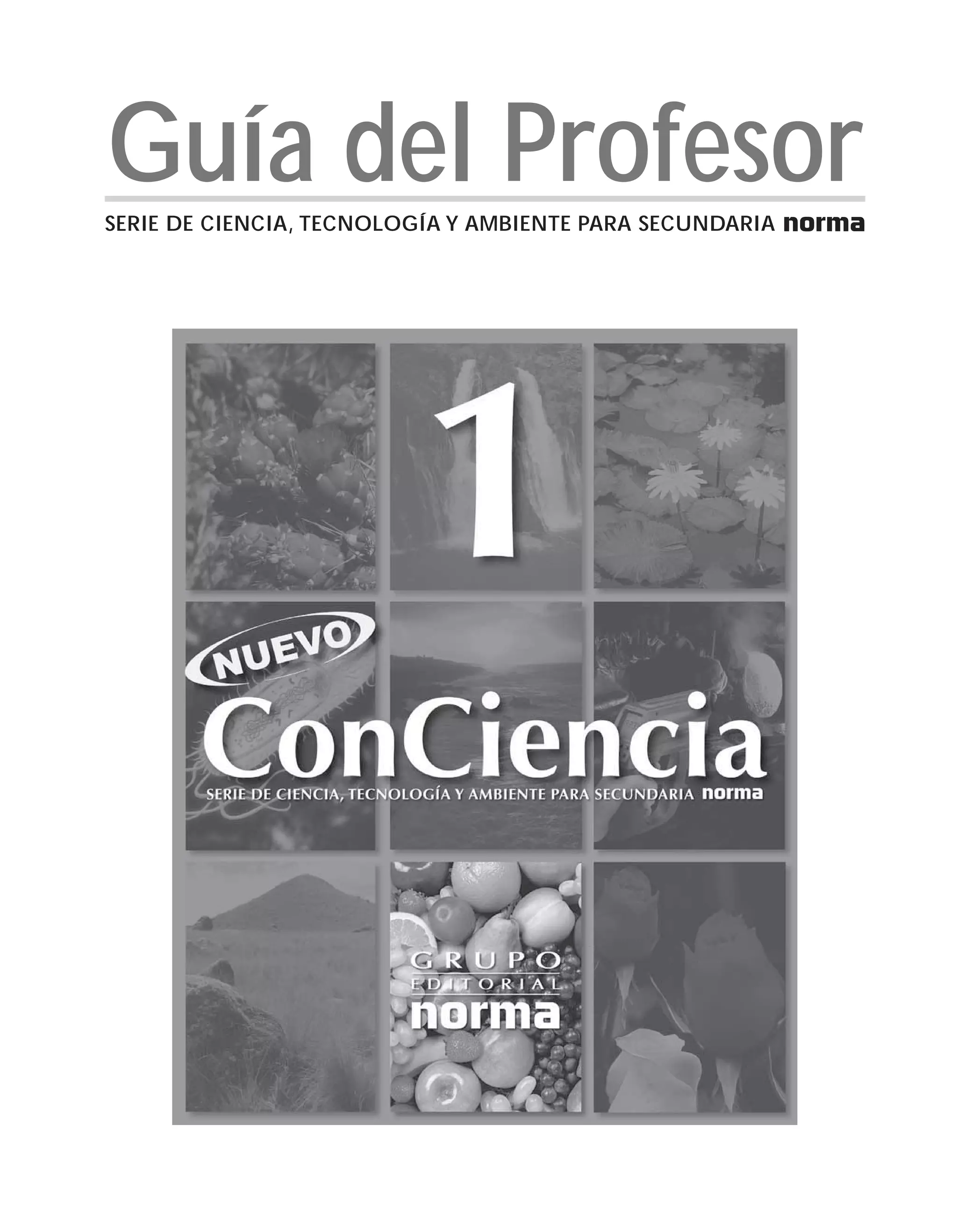 El documento presenta la guía del profesor para la serie de libros Nuevo ConCiencia sobre Ciencia, Tecnología y Ambiente para secundaria. Explica que la serie promueve el desarrollo integral de las personas y su relación con la tecnología y el ambiente mediante el desarrollo de capacidades científicas. Describe también que cada libro contiene 9 unidades con diferentes temas, y que cada unidad sigue un proceso de motivación, construcción de conocimientos, aplicación y evaluación de los mismos.