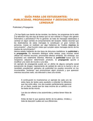El documento presenta una guía para estudiantes sobre publicidad, propaganda y desviación del lenguaje. Explica la diferencia entre publicidad y propaganda, y cómo ambas utilizan recursos similares pero con propósitos distintos. Luego analiza ejemplos concretos y figuras literarias como la metáfora y la personificación que desvían el significado literal de las palabras.