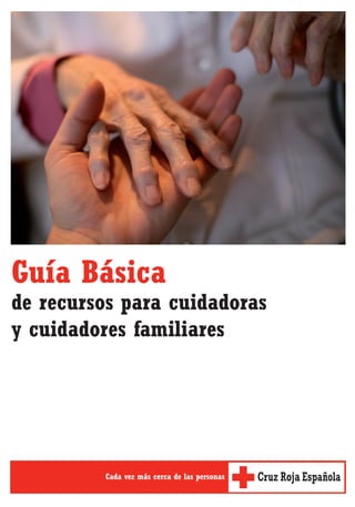 Este documento proporciona una guía básica de recursos para cuidadores familiares. Explica los servicios y prestaciones disponibles a través de la Ley de Dependencia, incluyendo servicios de teleasistencia, ayuda a domicilio y atención residencial. También describe los grupos de ayuda mutua que brindan apoyo emocional entre cuidadores, y productos de asistencia que facilitan las tareas diarias.
