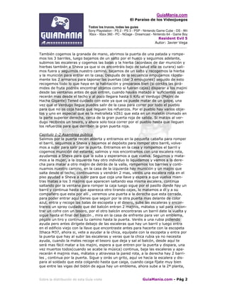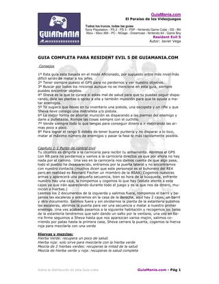 1) El documento presenta una guía detallada para completar el videojuego Resident Evil 5, incluyendo consejos, descripciones de niveles y jefes, y ubicaciones de objetos.