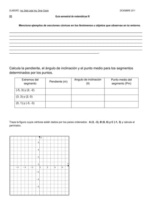 Este documento presenta una guía semestral de matemáticas III con preguntas sobre geometría analítica, línea recta, circunferencia y parábola. El estudiante debe completar la guía resolviendo ejercicios y problemas relacionados con estas temáticas.